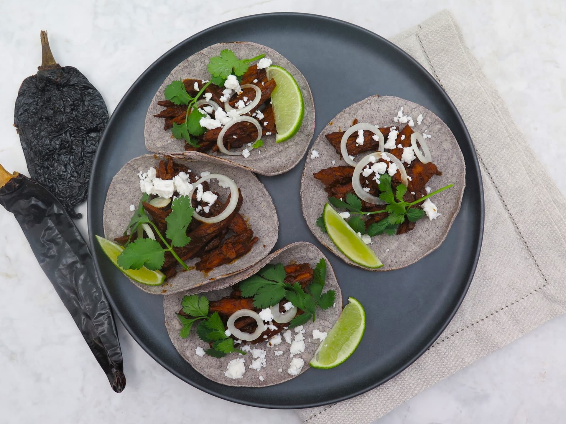 Chickn tacos made with Forever chickn-style shred, coated in our deep, rich, house-made salsa roja, made from gaujillo and ancho chillies. This delectable combination is wrapped up in a premium, hand-crafted blue corn tortilla and topped with cotija-style cheese sprinkles, onion, coriander and a drizzle of lime. Forever protein is made with natural, non-GMO ingredients, including pea, chickpea, mung-bean and fava-bean protein. It contains 29g of protein per 100g, all nine essential amino acids, and it is free from fillers, artificial additives, colours, flavours, and preservatives. Pantry items needed: olive oil Hands-on: 20 mins, ready in: 20 mins Cooking equipment: large non-stick frying pan, small pot Use within 5 days of receiving your meal kit