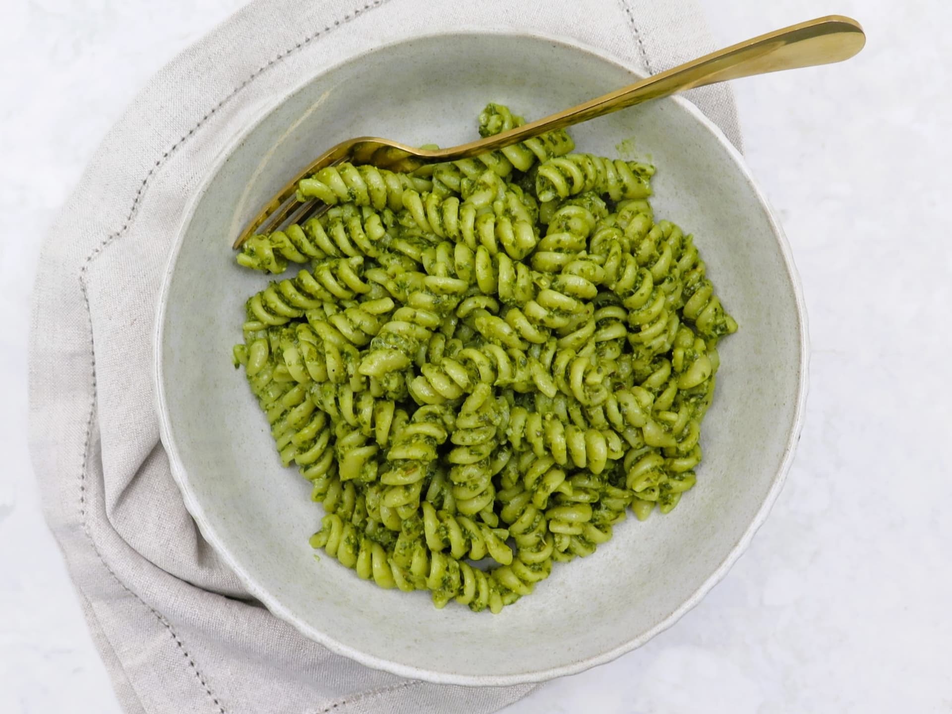 Premium La Molisana fusilli coated in our incredibly tasty housemade basil pesto, incorporating pinenuts and walnuts, a hint of thyme, lemon and a bundle of nutritional yeast for cheesiness (also making it much healthier than its traditional counterpart).