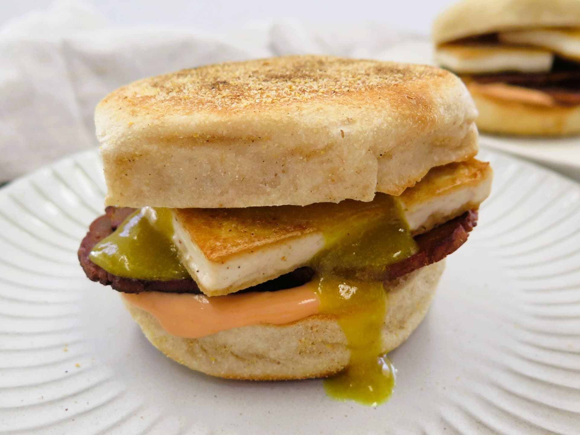 Sumptuous sourdough English muffins filled with house-made smoky rashers, egg-flavoured fried tofu, vegan egg yolk and special sauce. These breakfast muffins are easy to make and very easy to eat! Tastier than a McMuffin and kinder to your body and the planet. Pantry items needed: cornflour, vegetable oil Hands-on: 15-20 mins, ready in: 15-20 mins Cooking equipment: large non-stick frying pan, small pot Use within 5 days of receiving your meal kit.