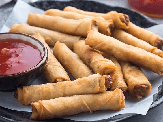 Crispy vegetable spring rolls packed with fresh, seasoned veggies. Perfectly golden, savoury, and best enjoyed with a tangy dipping sauce.