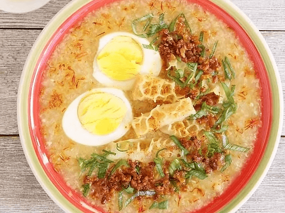 Our garlic features hearty chicken, garlic, and savoury broth with safflower and sticky rice, topped with scallions, eggs, and calamansi juice.