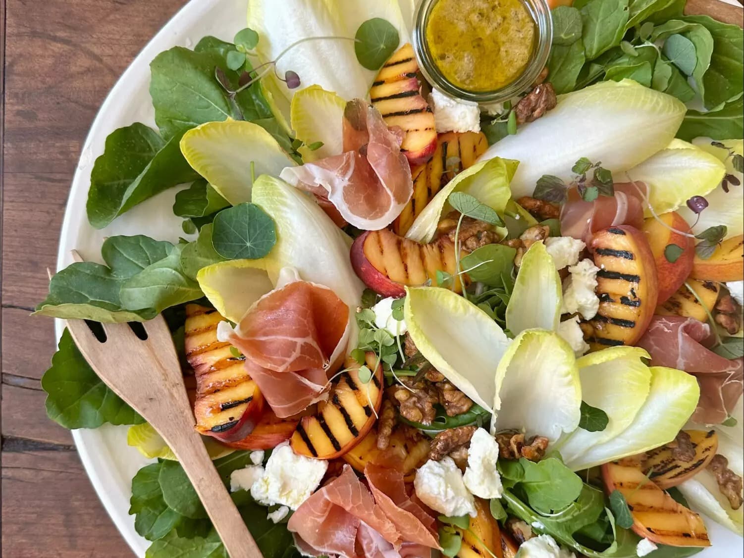SIZE: Serves 8-10 as part of the Christmas share table Succulent, char-grilled sweet summer peaches meet the delicate saltiness of finely sliced prosciutto. Elevated by a touch of marinated goat cheese, all resting upon a bed of crisp, fresh rocket and witlof leaves. To add a delightful crunch and a hint of sweetness, we crown this masterpiece with maple-toasted walnuts and a French vinaigrette. Contains Walnuts (packaged separately)