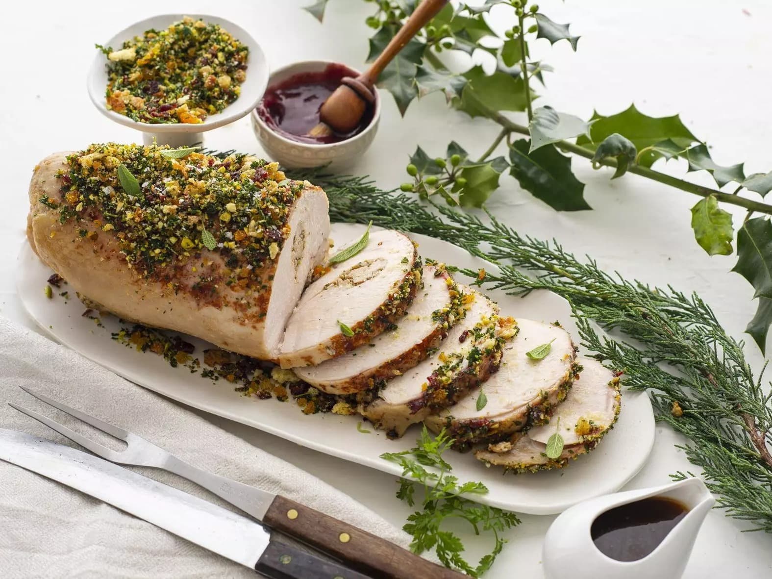 Fresh free-range turkey breast, brined and stuffed with beautiful chicken, date, apricot and sourdough stuffing finished with a zest of lemon, all neatly vacuum sealed, ready to bake and serve on Christmas day. We cook the turkey breast sous-vide method in a water bath very slowly till tender. All you have to do is brown in the oven according to the instructions provided, brush with our pre-made cranberry glaze and sprinkle on the delicious pork scratching crumble. Serve with gravy (included) we suggest a pot of our house made Cranberry and port chutney. | 1.8kg raw | 1.5kg cooked |