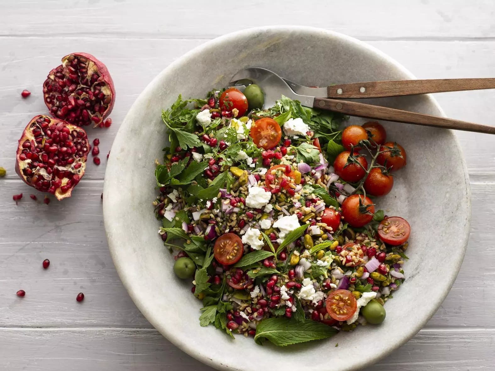 Our signature Christmas salad kit, loaded with grains, herbs, greens and pops of colour. Little jewels of fresh sour pomegranate and a scattering of soft feta cheese all wrapped up with fresh edible flowers and crunchy pistachio and herbs.
