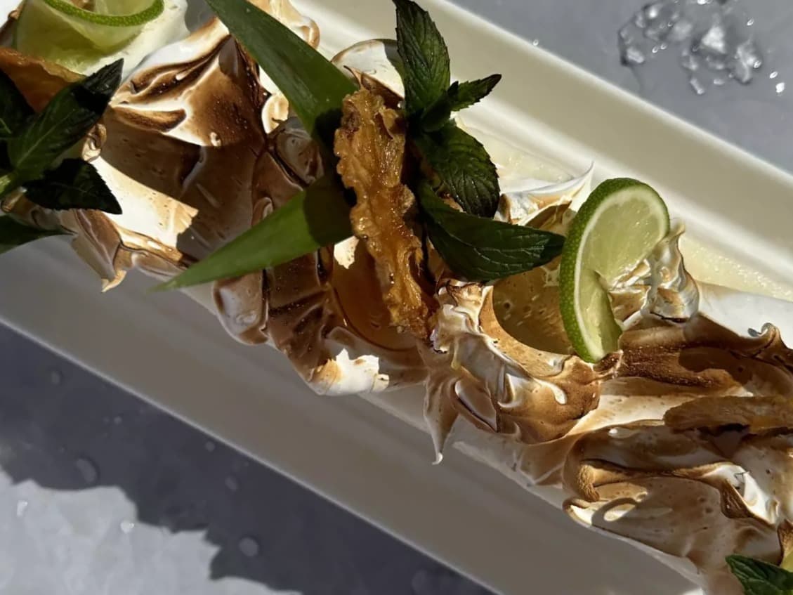Impress your guests with our delightful ice cream terrine! Whether you call it a terrine, bombe, or cake, this dessert is a showstopper. Layers of light Coconut sponge, peach ice cream, raspberry sorbet, and creamy vanilla ice cream come together for a stunning treat. It's all topped with beautifully scorched meringue for that perfect finishing touch. A modern twist on the classic Peach Melba, bringing all the flavours you love into one gorgeous dessert.