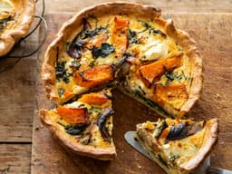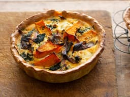 A delicious family quiche made with hand-made sour cream pastry filled with a silky-smooth egg custard, leek, cheese and spinach and pumpkin