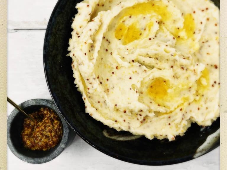 Creamy, buttery mashed potatoes folded with wholegrain seeded mustard for a gentle tang and subtle crunch.
