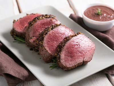 Riverina grass-fed beef fillet, marinated in herbs and garlic; seared and ready to finish in the oven. Just slice and serve with red wine jus. The fillet is packaged in 500g portion & feeds 4