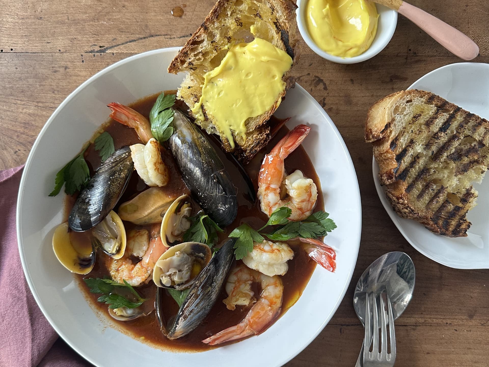 Transport your table to the sun-drenched coast of Marseille with this classic French seafood stew. Our rich, saffron-infused bouillabaisse is brimming with premium seafood, gently simmered in a fragrant broth of tomatoes, fennel, citrus, and aromatic herbs. Served alongside charred garlic toasts and a traditional rouille sauce—silky, garlicky, and delicately spiced—this dish delivers warmth, elegance, and unmistakable Mediterranean flavour in every spoonful.