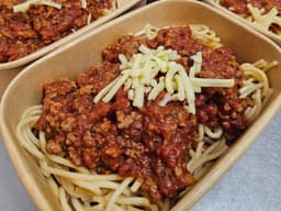 Rich beef Bolognese, with GF spaghetti and parmesan cheese.