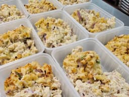 Tinned tuna (Fish), Sweetcorn, Red onion, Fresh parsley, Pasta (GF), Béchamel Sauce (GF) [Milk, Butter (Milk), Cheese (Milk), Flour (GF)]