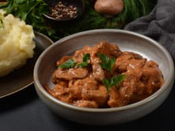 Tender beef, mushrooms and onions in a creamy, rich sauce, served with rice.