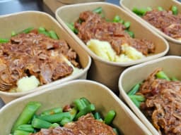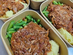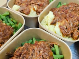 Brown sugar, Lamb, Tinned tomatoes, Onion, Carrots, Tomato paste, Mixed Italian herbs, Mixed fresh herbs, Green beans, Mashed potato, Garlic, Salt, Pepper, Beef stock powder GF (Wheat, Soy)