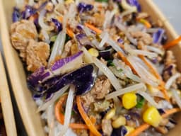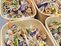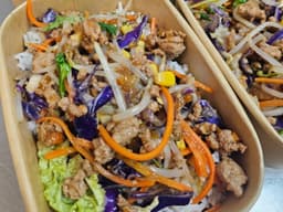 Oyster sauce (GF) (Mollusc, Soy), Bean shoots, Pork mince, Carrots, Onion, Garlic, Ginger, Soy sauce (GF), Red cabbage, White cabbage, Steamed rice