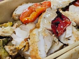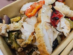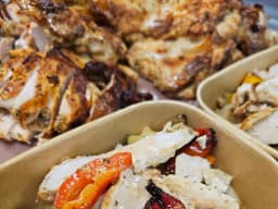 Lemon, garlic and herb seasoned chicken, roasted on a bed of capsicum, potatoes, onions, eggplant and zucchini and lemons.