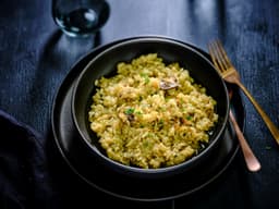 Homemade chicken stock [Water, Chicken, Spring onion, Carrots, Parsnip, Celery, Ginger, Parsley, Salt, Pepper], Rice, Mushrooms, Onion, Herbs, Garlic, Salt, Pepper, White wine, Extra virgin olive oil