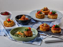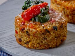 Our Mushroom risotto is a set risotto which is pan-fried with rice flour and contains Wild mushroom, pesto and parmesan.