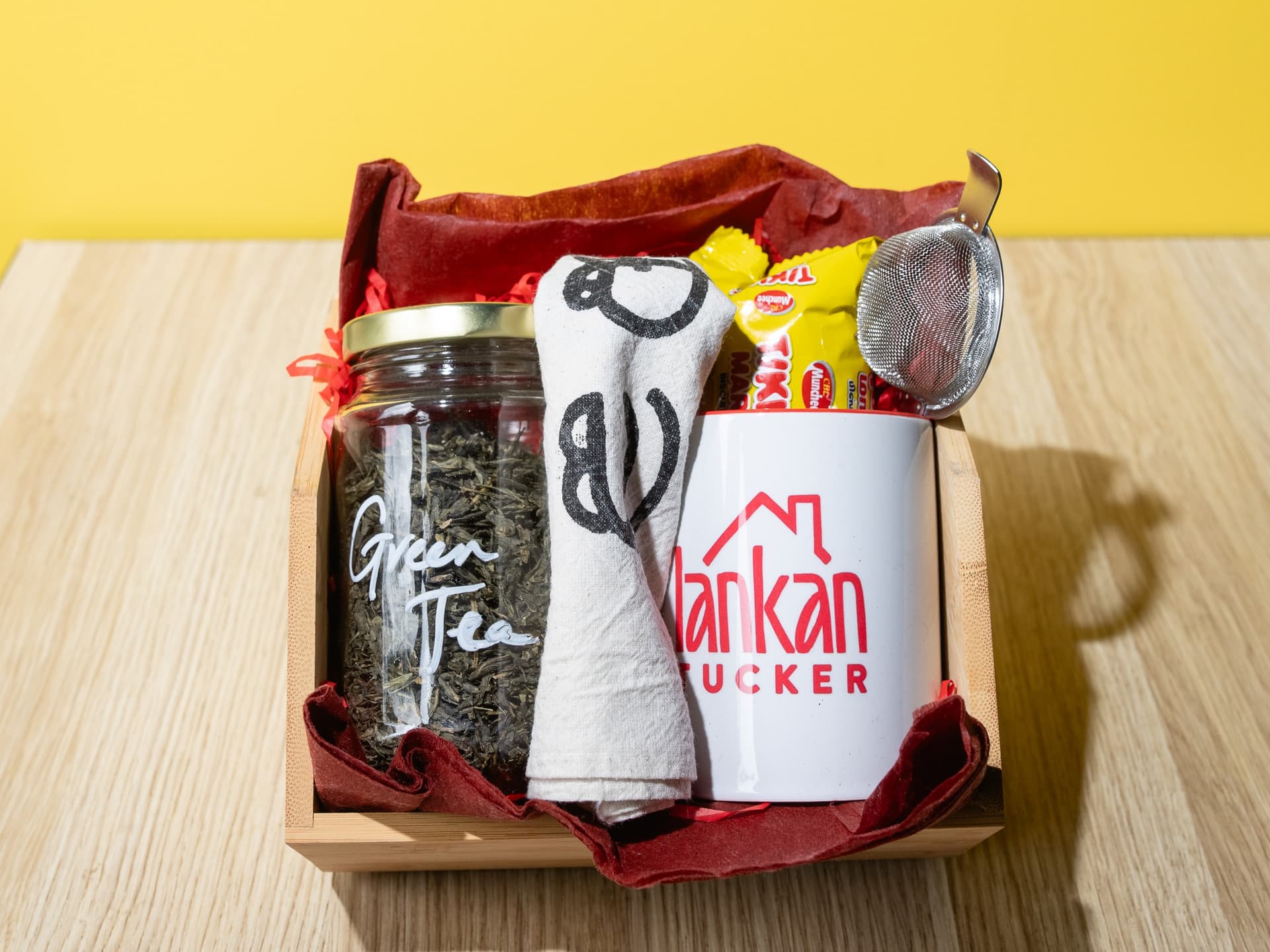1 x loose leaf tea 1 x tea strainer 1 x tea towel 1 x Lankan Tucker mug 1 x Tiki Marie biscuits
