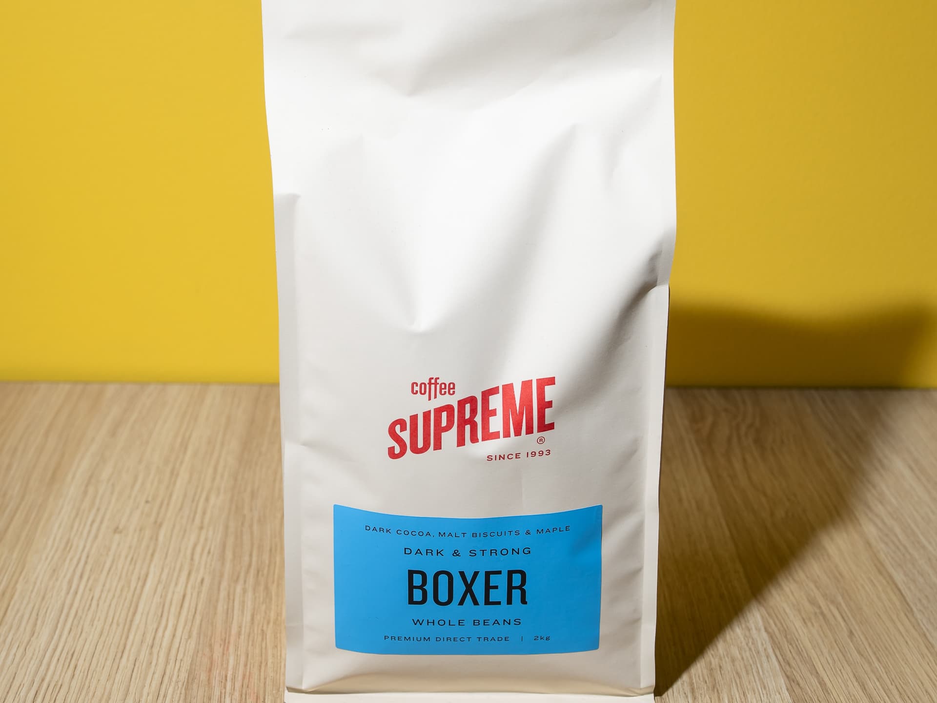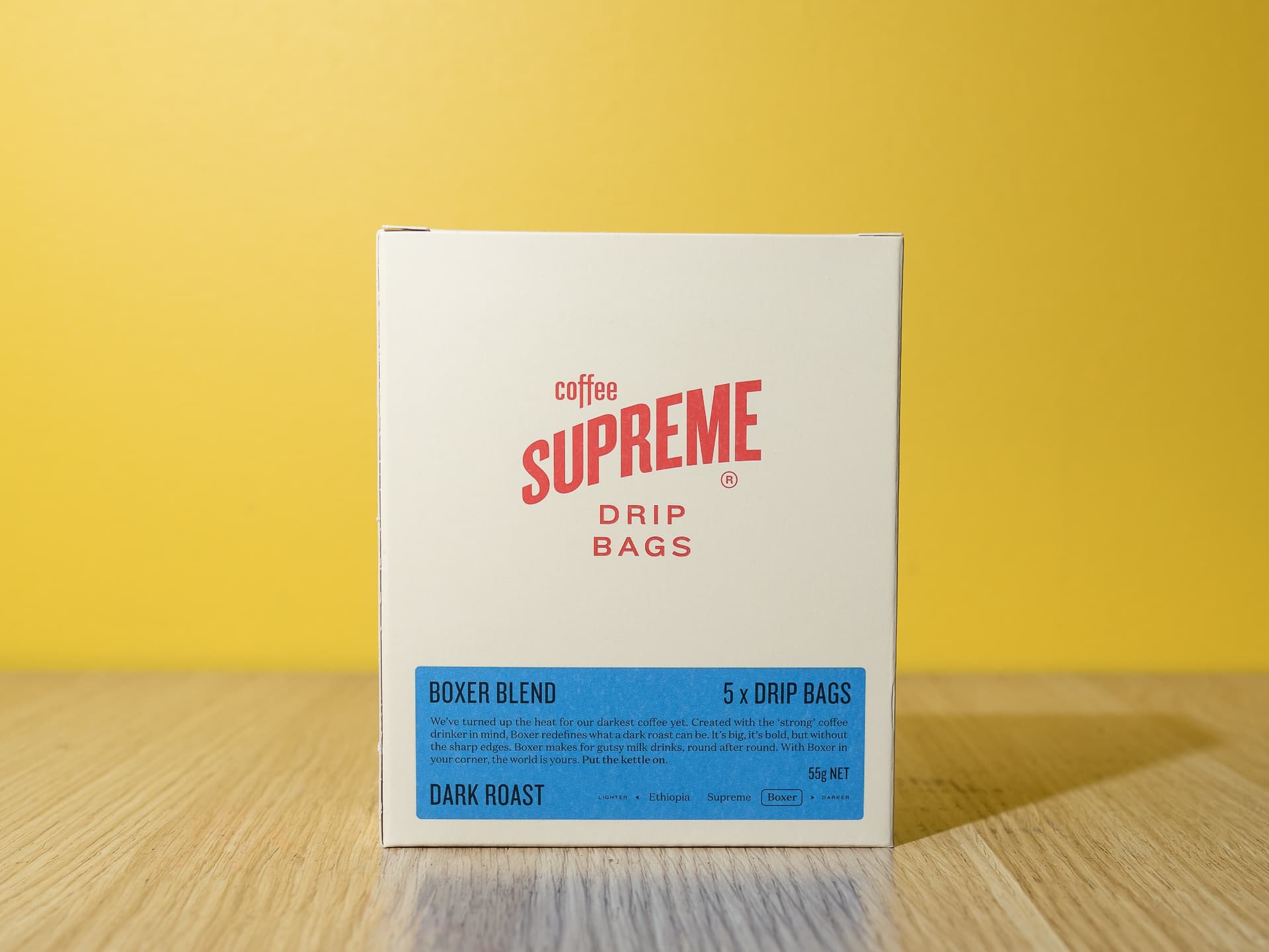 Coffee Supreme Drip Bags are ground perfect, pre-portioned, compostable, and nitro-flushed to preserve coffee freshness. Designed to produce a great cup of coffee on the move or simplify your morning routine, these Drip Bags make brewing high-quality coffee effortless. No need to pore over this pour-over. It’s good coffee, real easy. We’ve turned up the heat for our darkest coffee yet. Created with the 'strong' coffee drinker in mind, Boxer redefines what a dark roast can be. It’s big, it’s bold, but without the sharp edges. Boxer makes for gutsy milk drinks, round after round. With Boxer in your corner, the world is yours. Just tear open, pour over, and sip away. • Dark roast • 5 sachets per box
