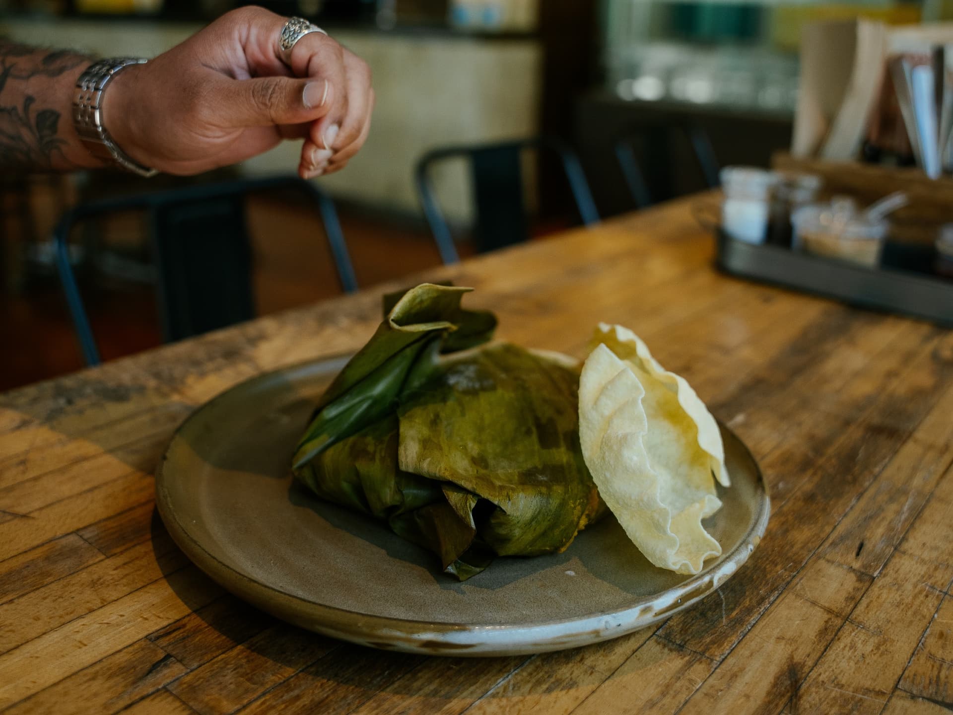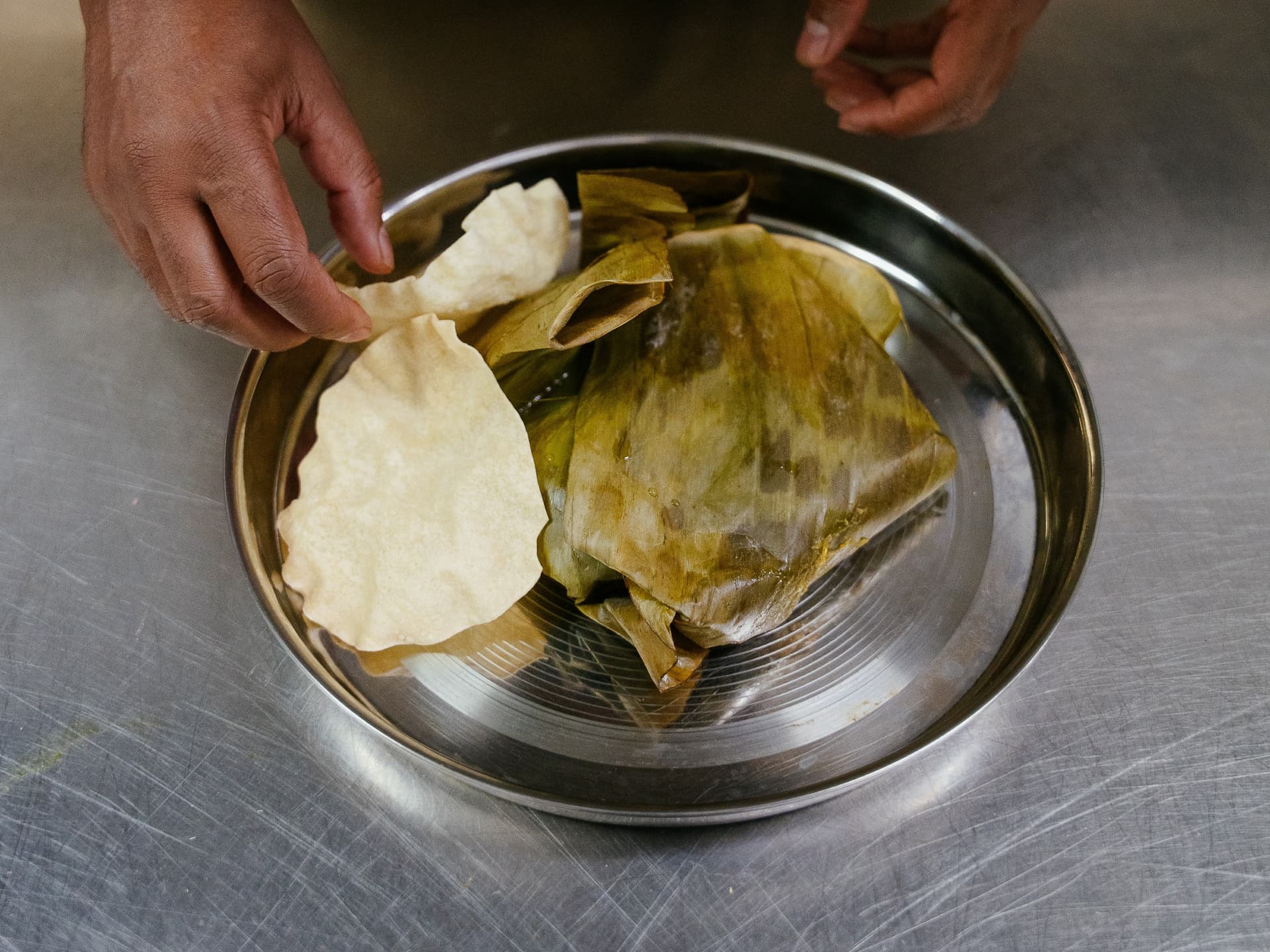 Steamed banana leaf parcel filled w rice, lentils, coconut veg curry, coconut sambol, plus pappadums on the side! SERVED COLD Must heat up to enjoy!