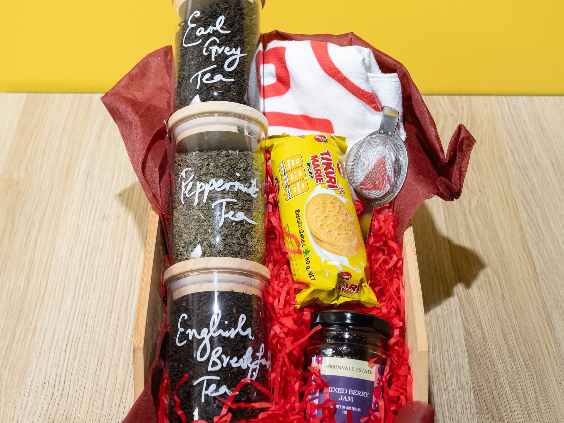 3 x loose leaf teas 1 x tea strainer 1 x Tiki Marie biscuits 1 x tea towel 1 x jam