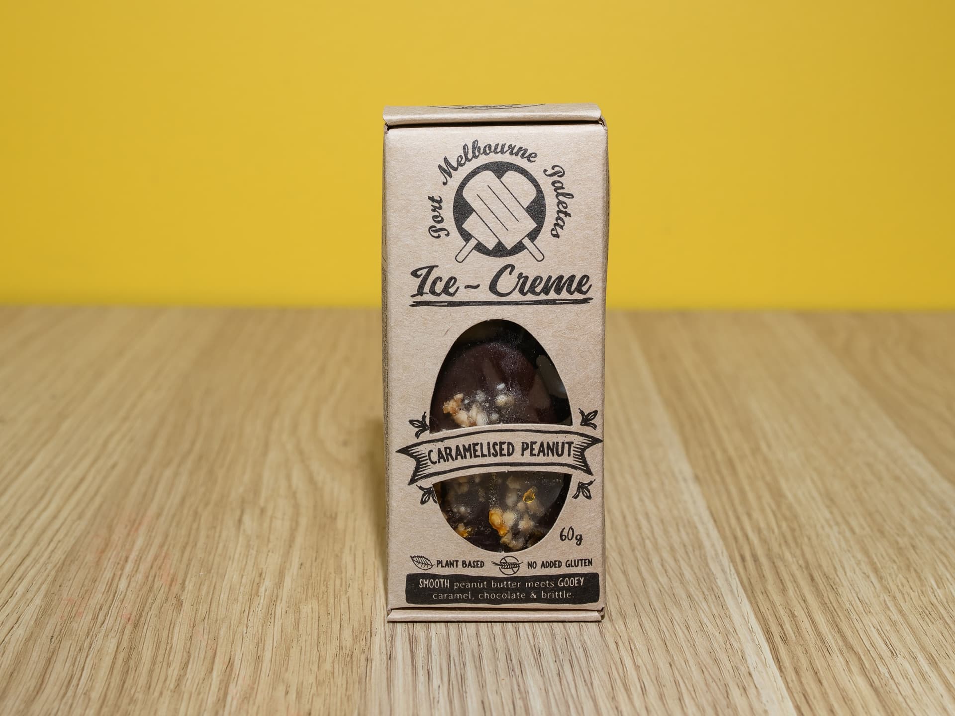 Caramelised Peanut paleta is a premium, award-winning, plant-based frozen dessert described as a creamy peanut butter ice cream base, loaded with gooey caramel, crunchy house-made peanut brittle, and finished with a thick chocolate shell. It is a crowd favourite designed for a dense, velvety texture. SERVED FROZN