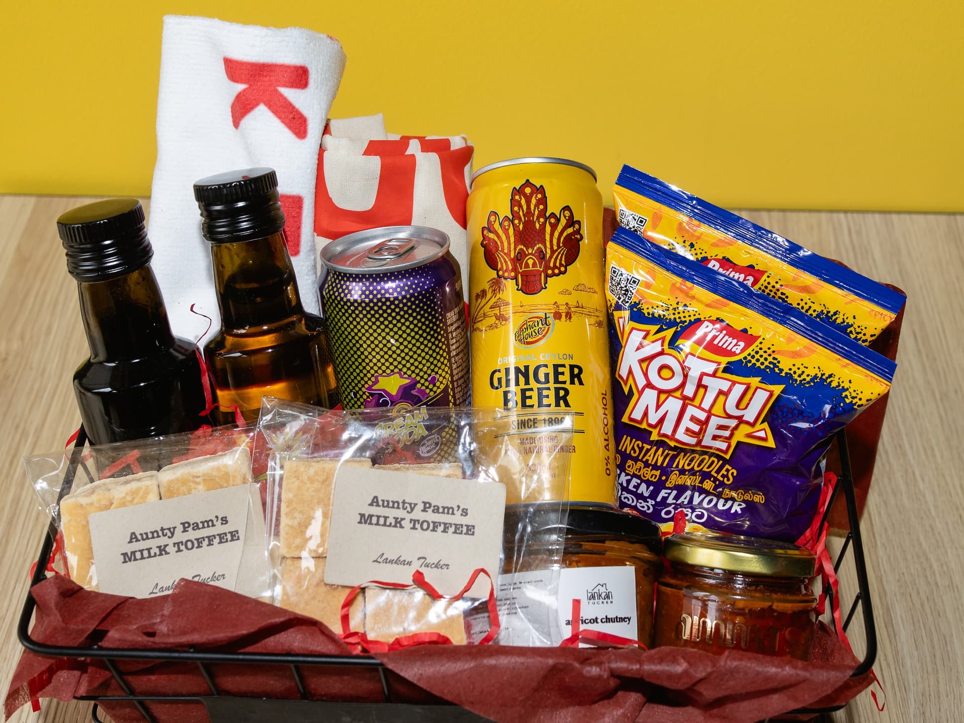 Gift Basket contains: 1 x tea towel 1 x LT tote bag 1 x olive oil 2 x milk toffee packs 1 x ginger beer 1 x cream soda 1 x apricot chutney 1 x ammas chutney 1 x apricot chutney