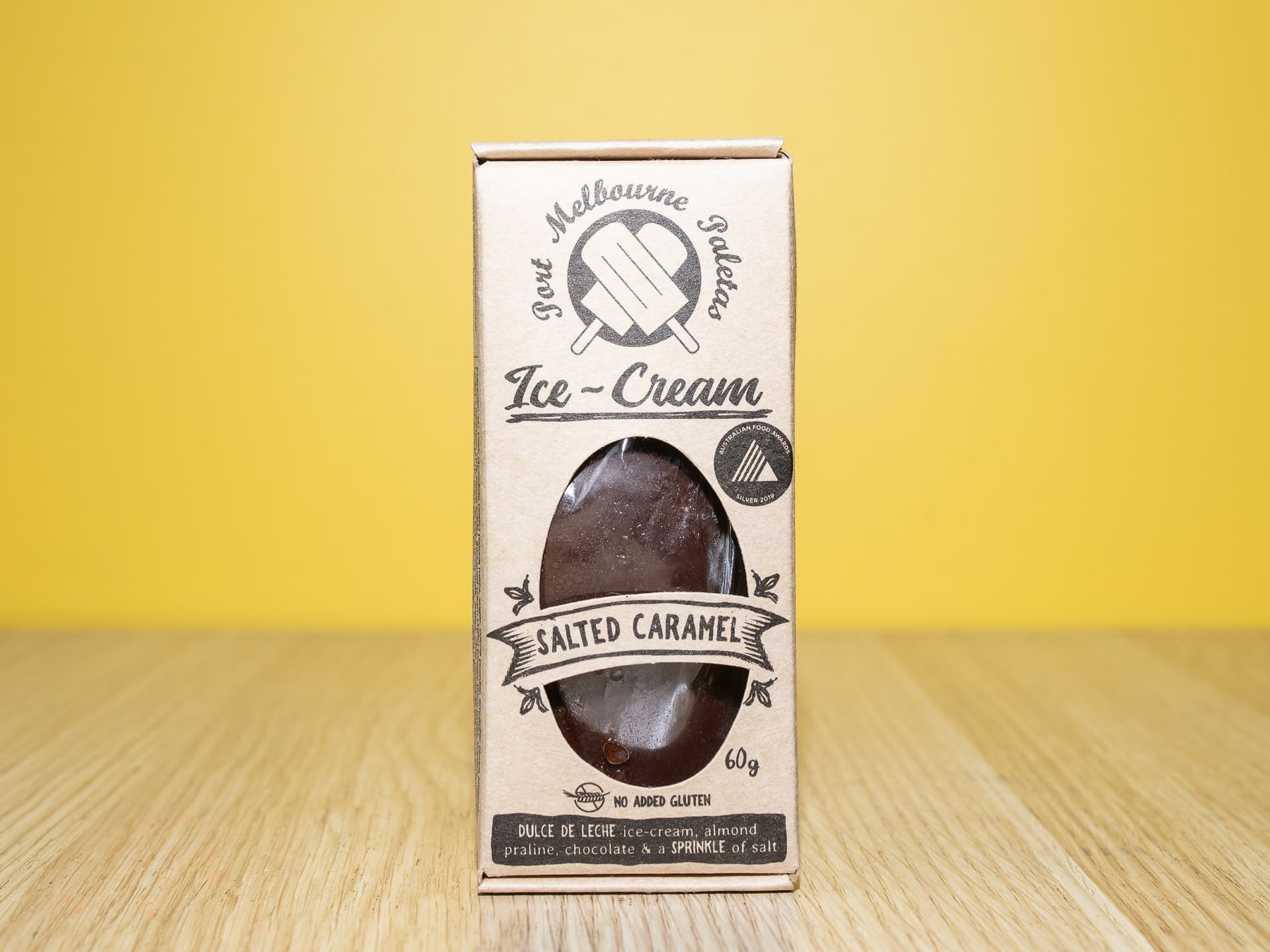 The Port Melbourne Paletas Salted Caramel is a gluten-free, decadent ice cream bar featuring thick, crispy almond praline and dulce de leche caramel, smothered in dark chocolate and finished with Murray River salt flakes. It offers a rich, dense texture—distinct from standard churned ice cream—inspired by Argentinean flavors. SERVED FROZEN