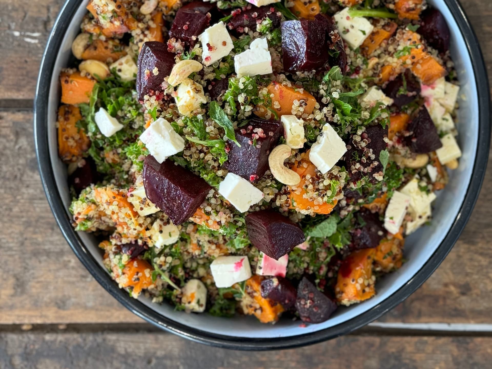 Roasted beetroot & sweet potato with quinoa, cashews and feta