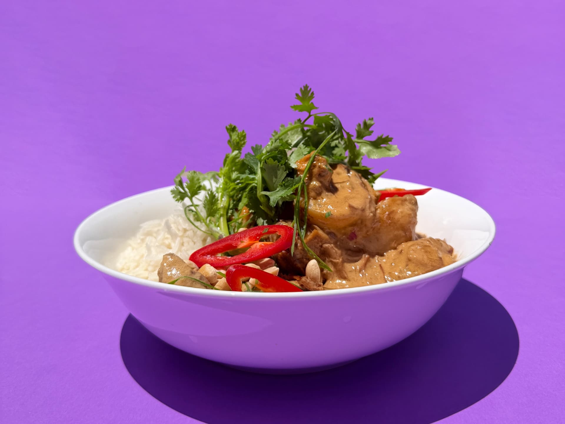 Fragrant tender beef slow cooked with potato and peanuts, served with steamed rice. FROZEN serves 1
