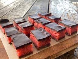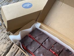 Biscuit base with a chewy cherry & coconut filling, topped with dark chocolate. Bite sized portions