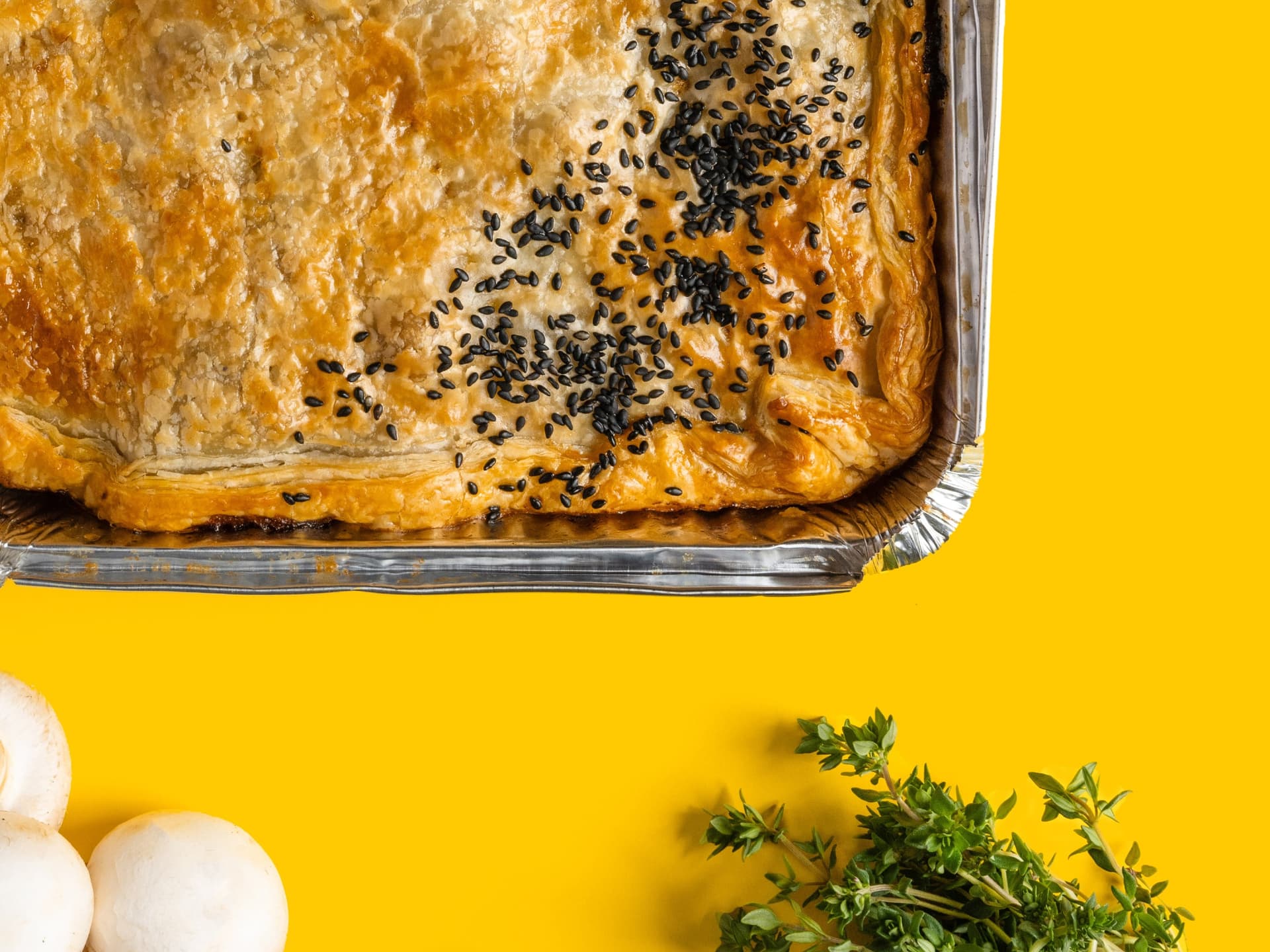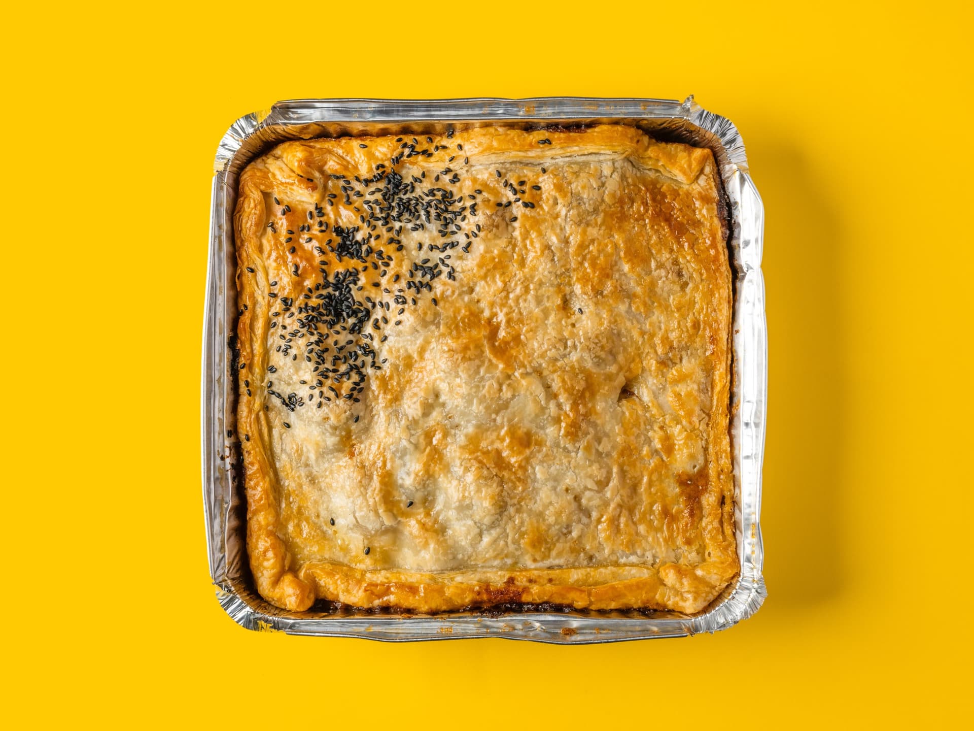 Tender braised beef with mushrooms in a rich gravy topped with flaky puff pastry. FROZEN serves 1-2. Foil tray.