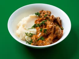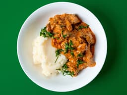 Beef, Mashed potato [Potato, Butter (Milk), Salt, Pepper], Sour cream (Milk), Mushrooms, Onion, White wine, Cornichon, Paprika, Salt, Garlic, Dijon mustard, Thyme fresh, Cornflour (GF), Pepper, Bay leaves