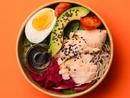 Nourish bowl is a nutritious meal composed of Baked Salmon, noodles, salad, avocado, boiled egg and dressing. Serves 1-2