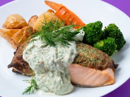 Salmon fillet with a white wine, dill and mustard sauce, cocktail potatoes, greens & carrots. FROZEN serves 1