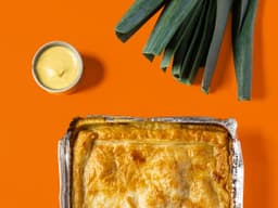 Our BEST SELLING Chicken & Leek pie consists of tender pieces of chicken with vegetables, all enveloped in a creamy sauce and encased with a flaky pastry crust top. FROZEN Served in a foil tray.