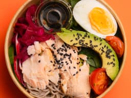 Nourish bowl is a nutritious meal composed of Flaked Baked Salmon fillet, noodles, salad, avocado, boiled egg and dressing. Serves 1-2