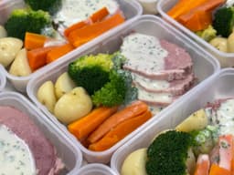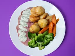 Traditional corned beef with a mustard parsley sauce and steamed vegetables FROZEN serves 1