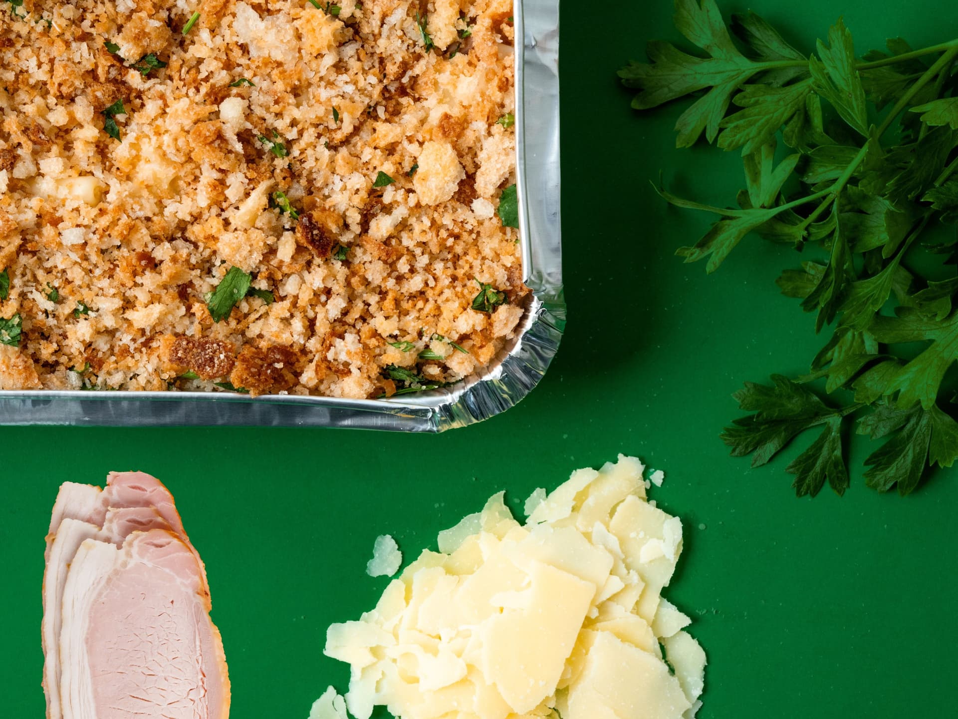 Macaroni pasta in a cheesy bechamel sauce, with bacon pieces. Topped with a sourdough breadcrumb pangratatto. FROZEN. Foil Tray