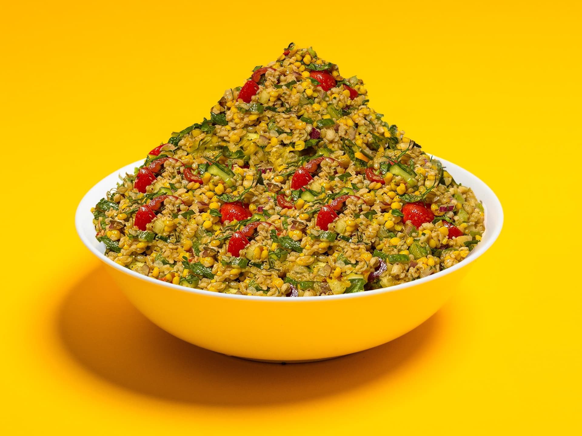 Freekah and pearl couscous with cherry tomato, cucumber, red onion, celery and fresh herbs, tossed with roasted walnuts and a lemon, olive oil & pomegranate molasses dressing. VEGAN