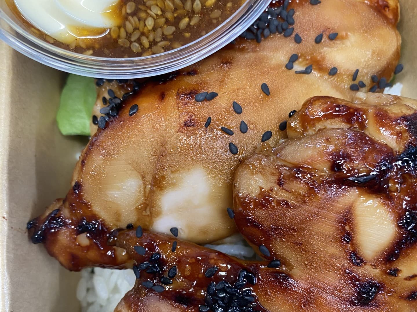 Chicken thighs marinated w/ house made teriyaki sauce. Served with rice, greens & kewpie