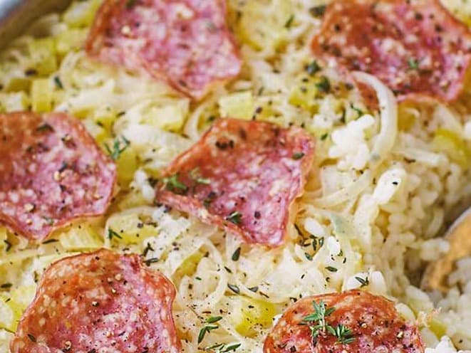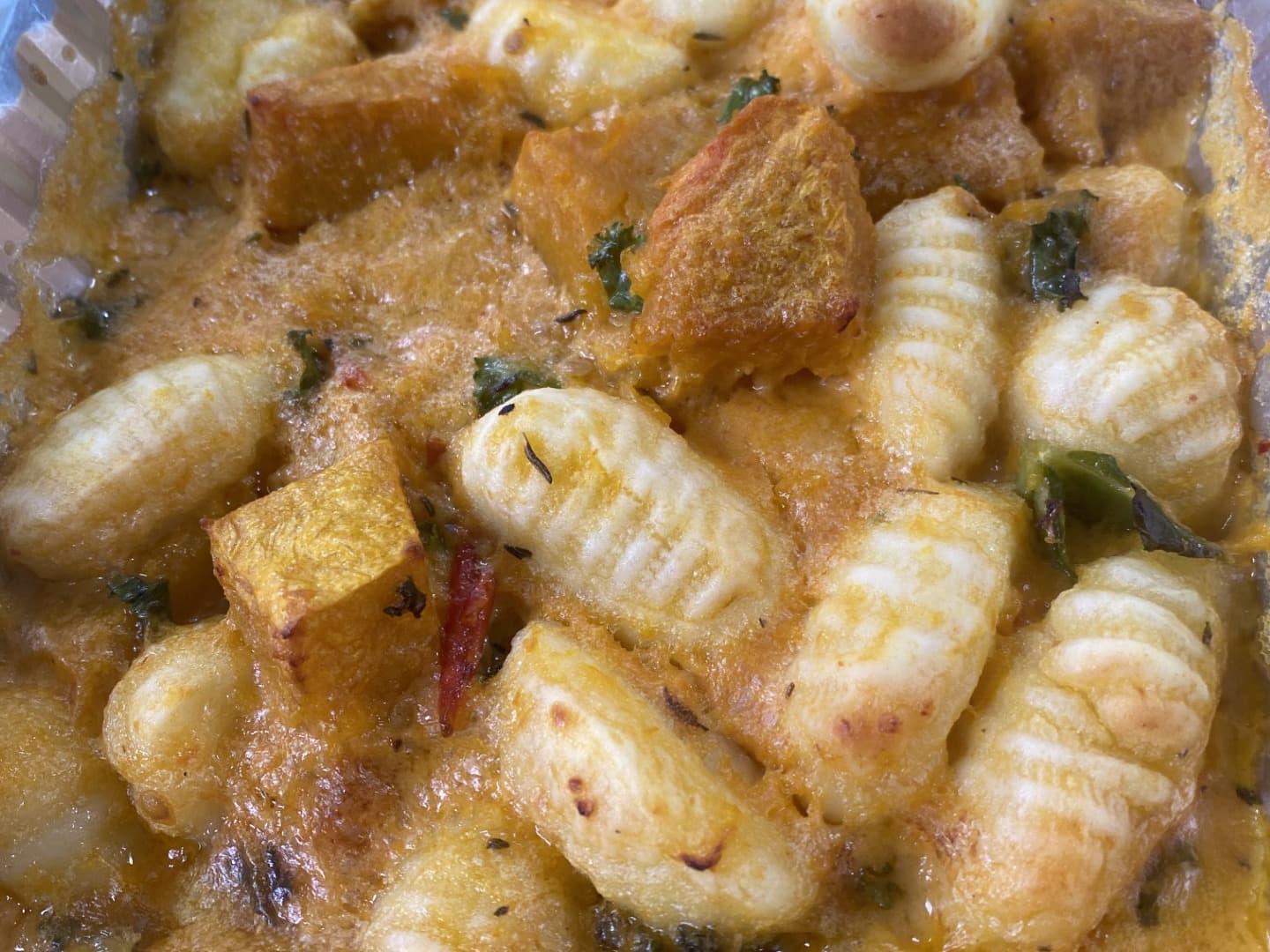 Creamy, tomato, garlic and kale baked with roasted pumpkin and gnocchi