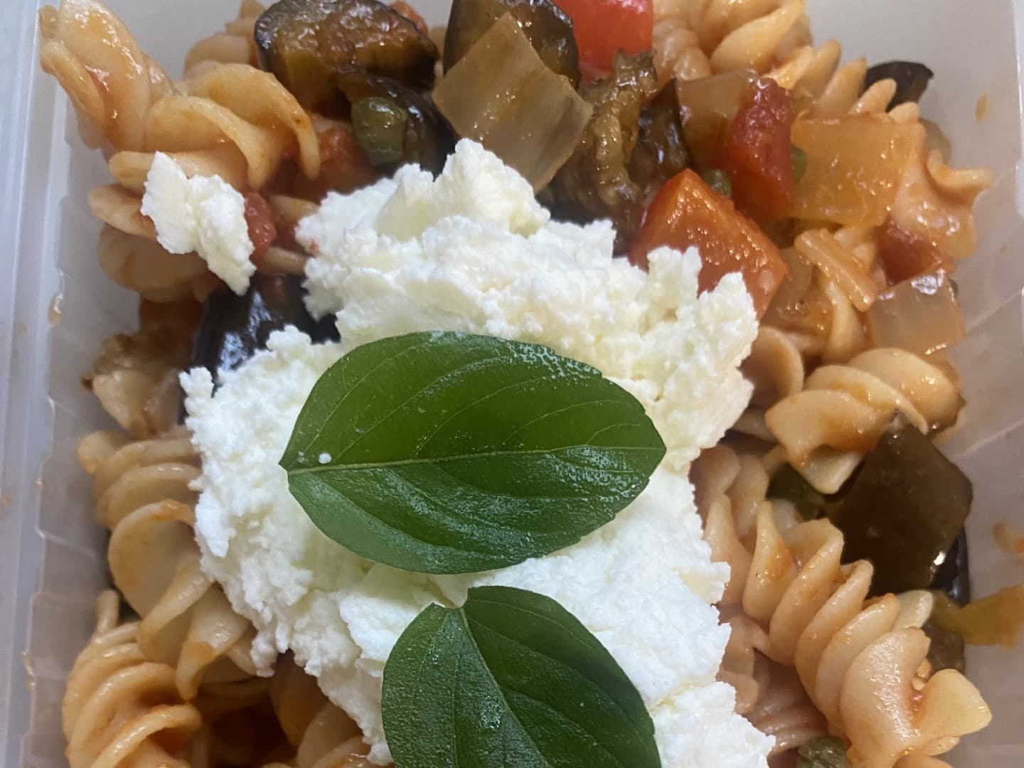 Roasted eggplant, cherry tomatoes, creamy ricotta w/ basil & olives.