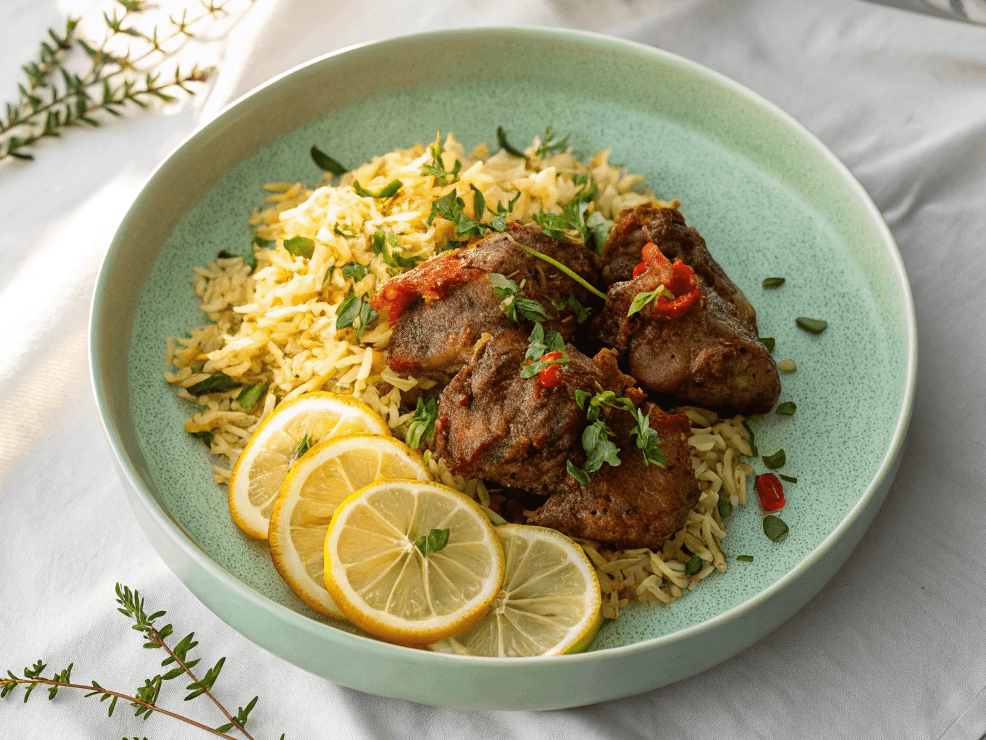 Slow-braised lamb shoulder infused with bold harissa and bright lemon, served over aromatic Indian pilaf. Finished with fresh herbs and a hint of pomegranate, this dish is a perfect balance of spice, zest, and tenderness, delivering deep, comforting flavours in every bite.