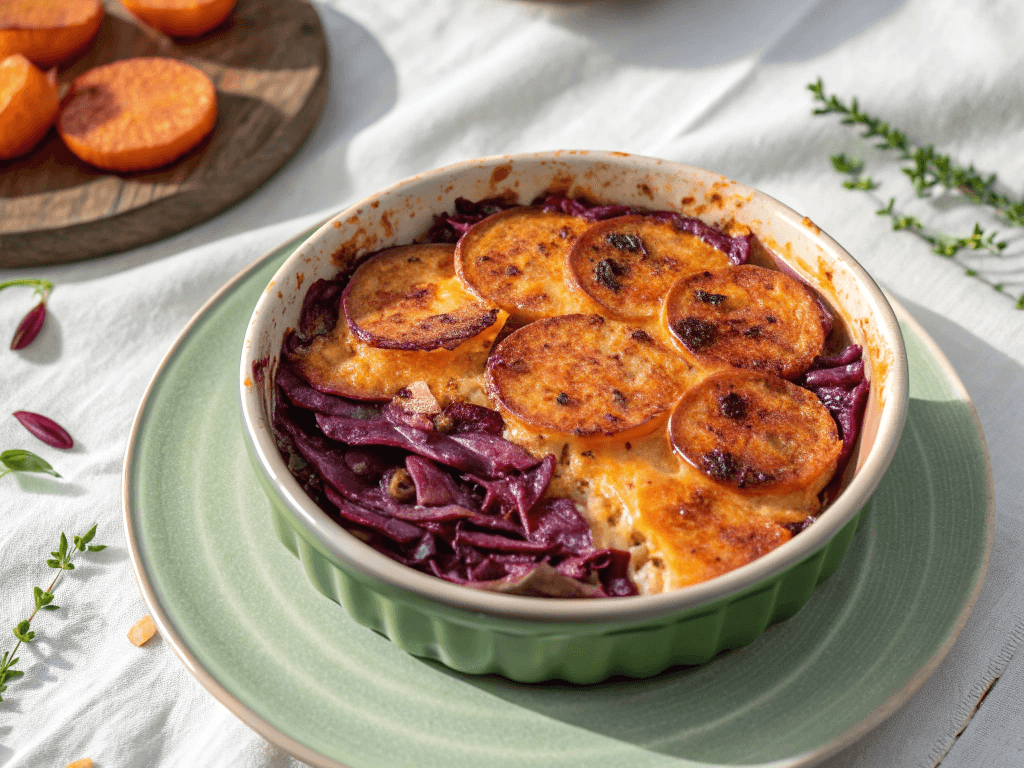 Layers of tender sweet potato and vibrant red cabbage baked in a creamy, cheesy sauce with golden crisp edges. A colourful, comforting gratin that’s rich, hearty, and perfect as a standout side or a satisfying vegetarian main.
