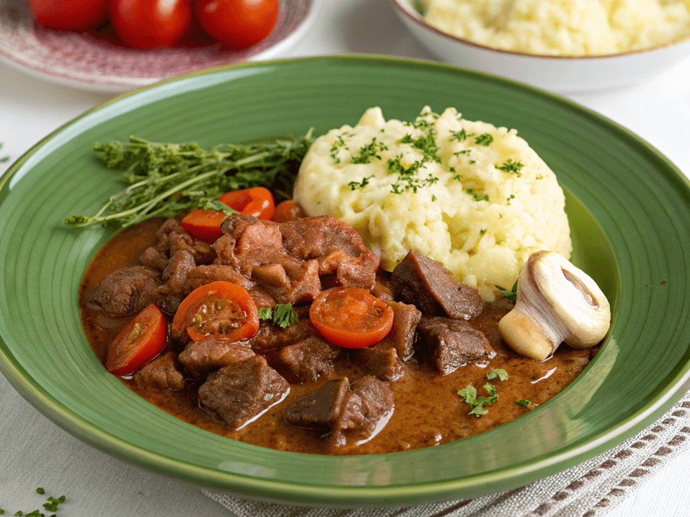 Slow-cooked beef goulash, rich with tomatoes, smoky bacon, and earthy mushrooms, served over silky potato purée. Hearty, bold, and deeply comforting, this is soul food with serious flavour firepower.