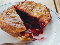 Sour pitted cherries with a maraschino cherry sauce and buttery puff pastry. Goes great with a scoop of vanilla or dark chocolate ice cream. Think black forest gateuax vibes :) We do our best to avoid pits, but sometimes they sneak their way in. Consume with care!