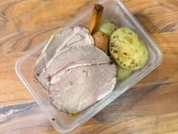 Slices of Roast Lamb. Roast Pumpkin, Carrots & Potato with a tub of gravy to complete the meal.