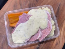 Corned beef, Mash Potato [Potatoes, Milk (Coles), Butter (Western Star) (Milk), Chicken booster (GF) Maggi], Roasted carrot, Bechamel Sauce [Milk (Coles), Water, Flour (GF), Butter (Western Star) (Milk), Parmesan cheese (Coles) (Milk), Salt], Dijon mustard (Masterfoods), Seeded Mustard (Masterfoods)