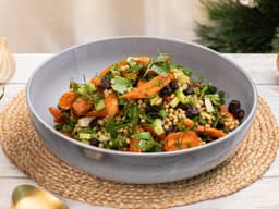 Carrot, Pearl couscous (Wheat), Raisins, almonds, Celery, Spring onion, Parsley, Coriander